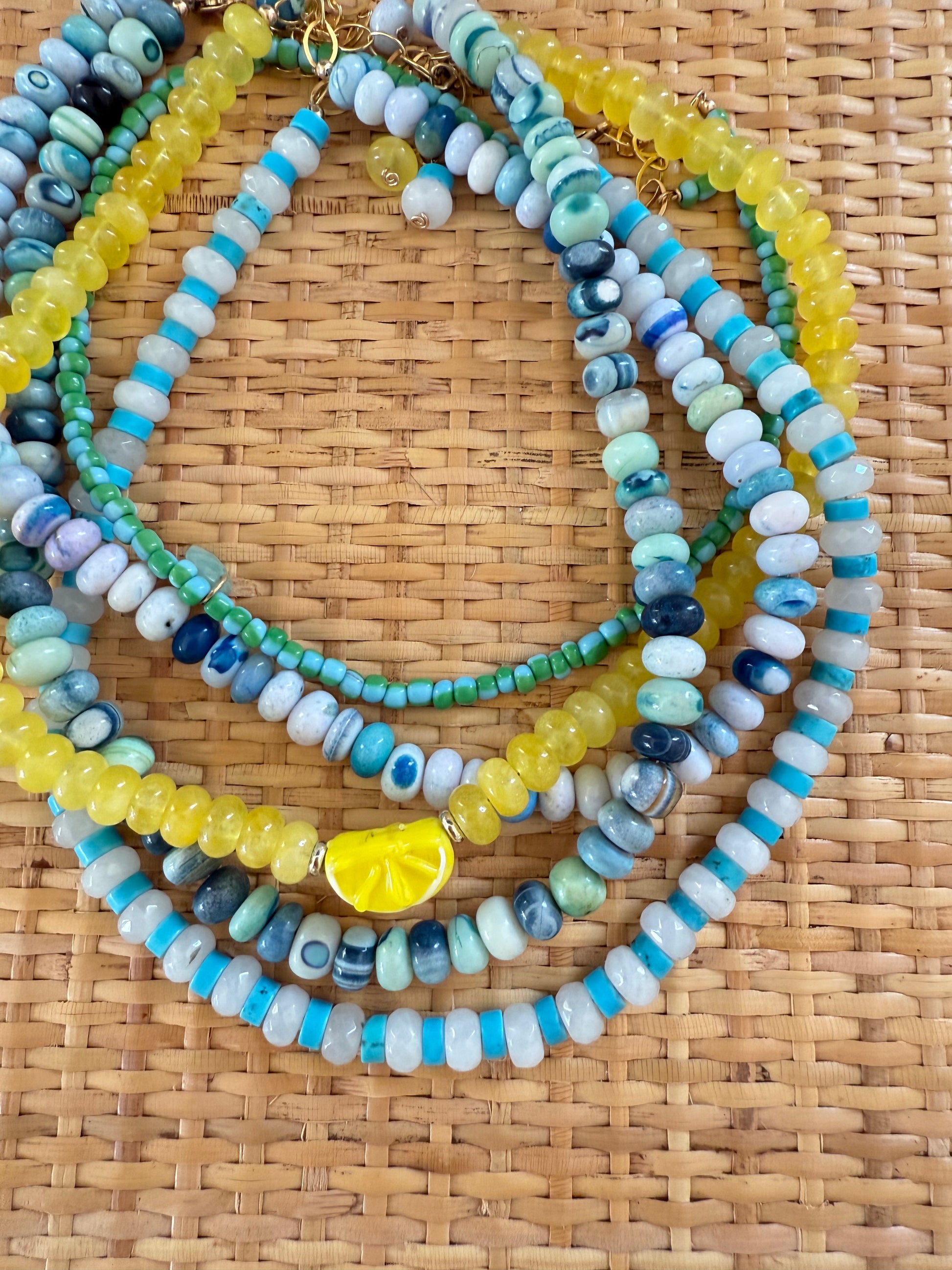 This necklace is handmade by Allegra. It is yellow gemstones with gold accents and a blown glass lemon. The clasp and chain closure is 14kt gold filled. Due to natural stones, color shades may slightly vary.