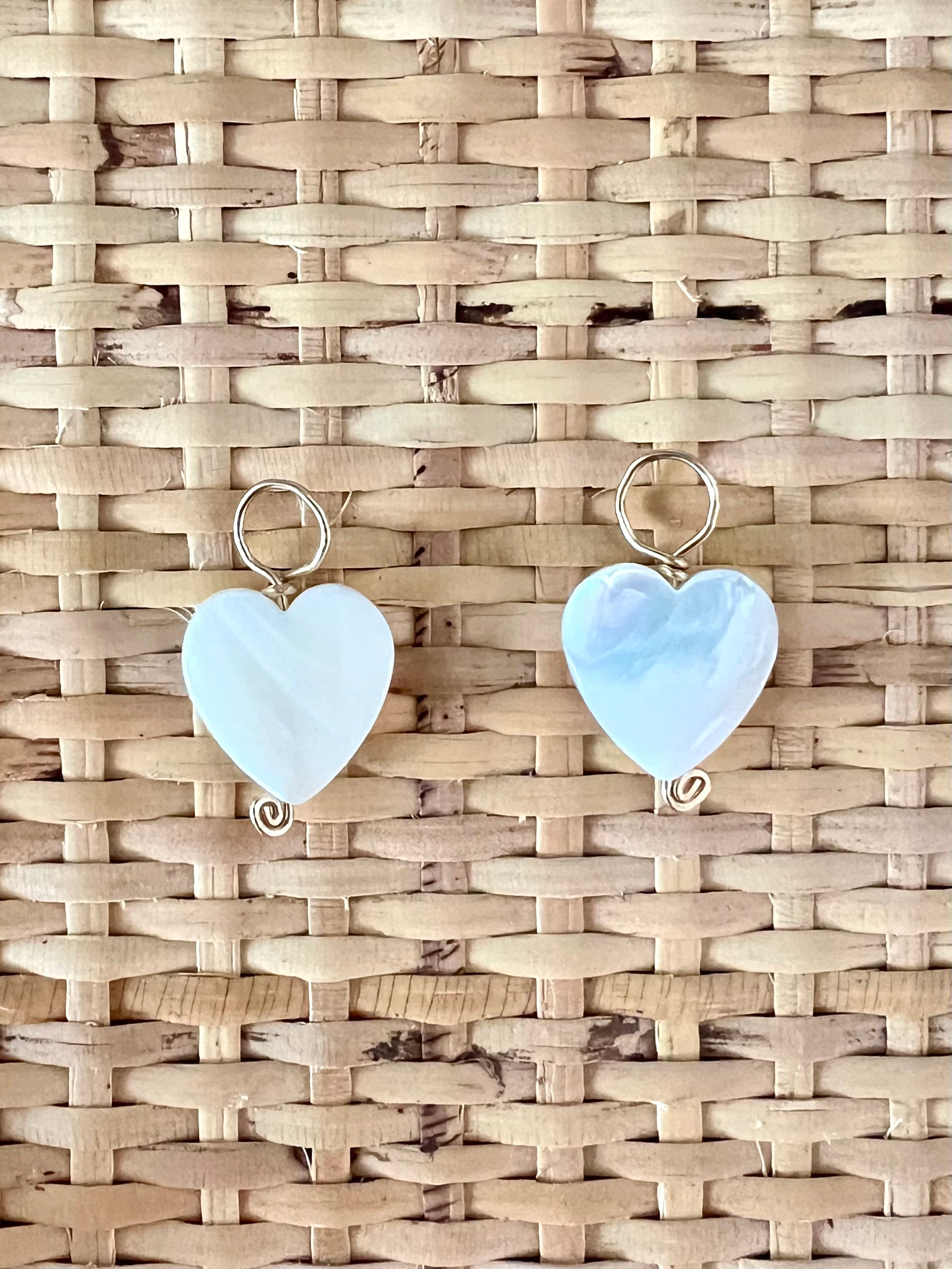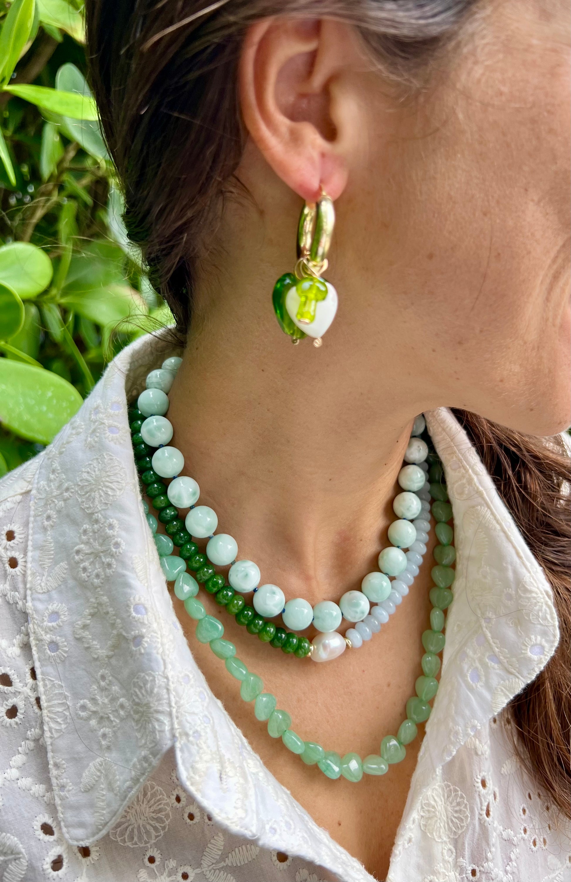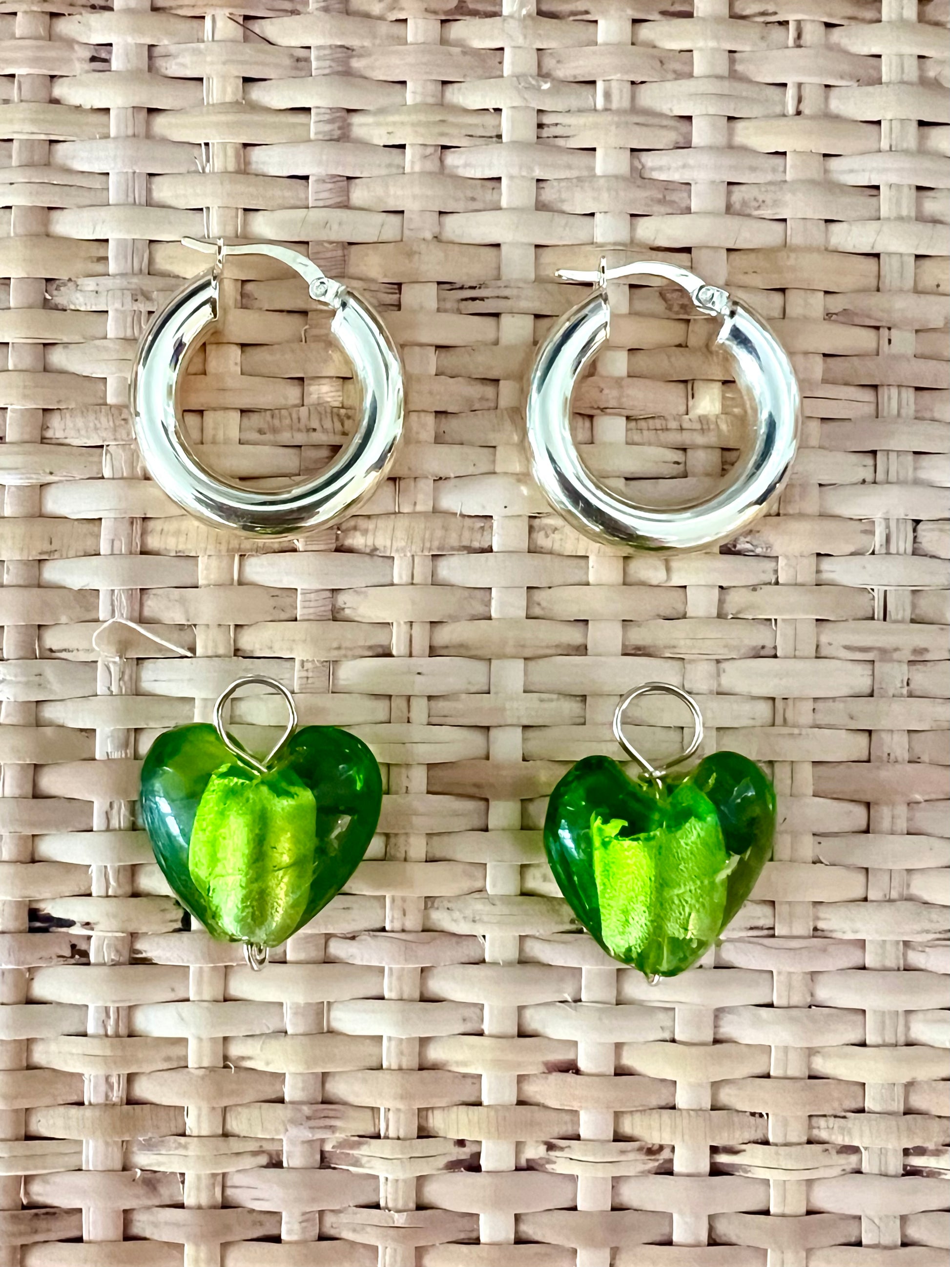 Charms include 2 blown glass green hearts, 2 mother of pearl hearts, and 2 blown glass green mushrooms. Each charm is handmade with 14kt gold-filled wire.
